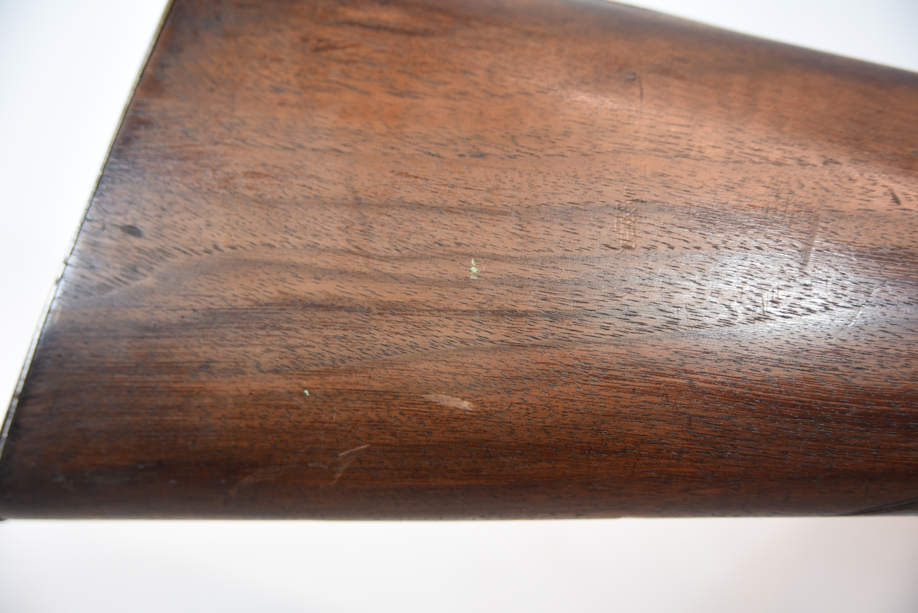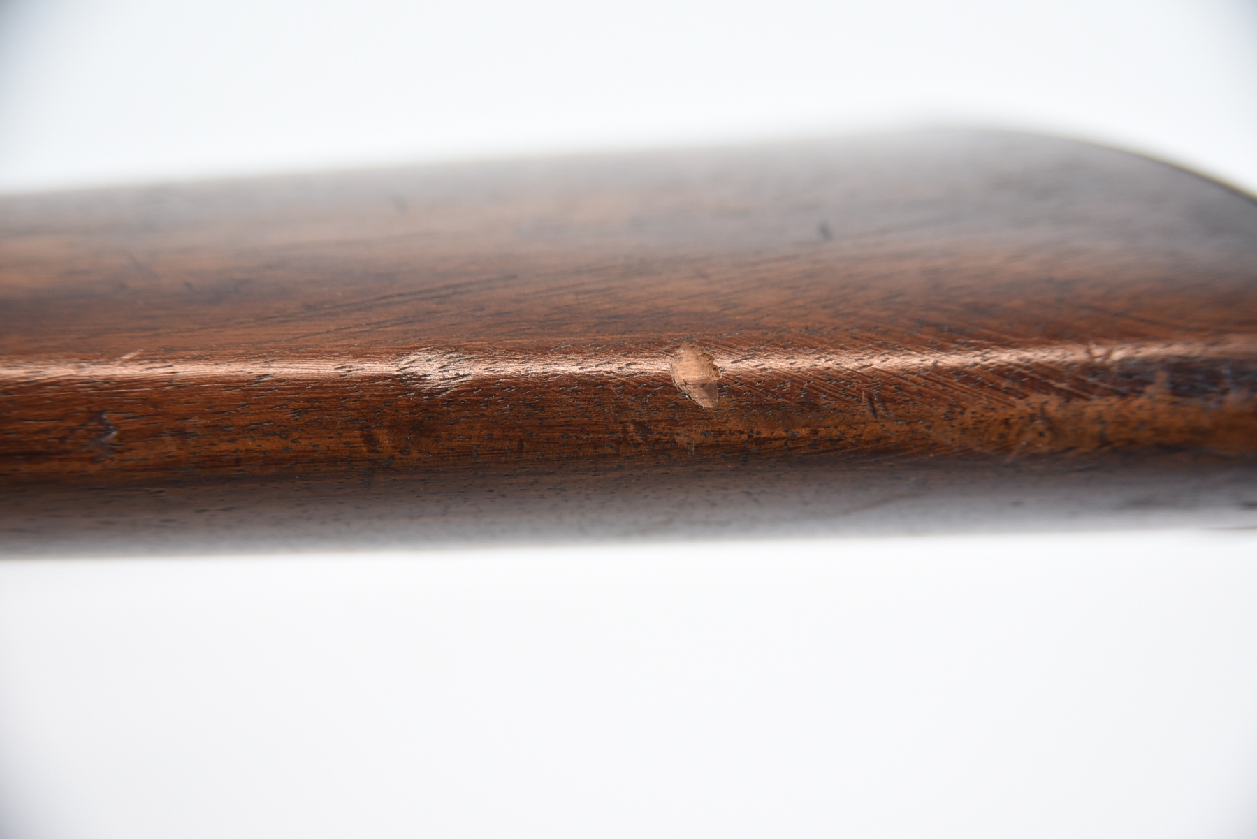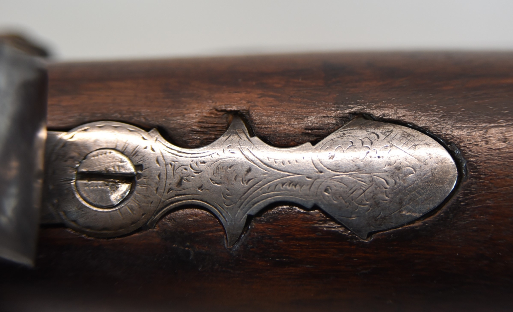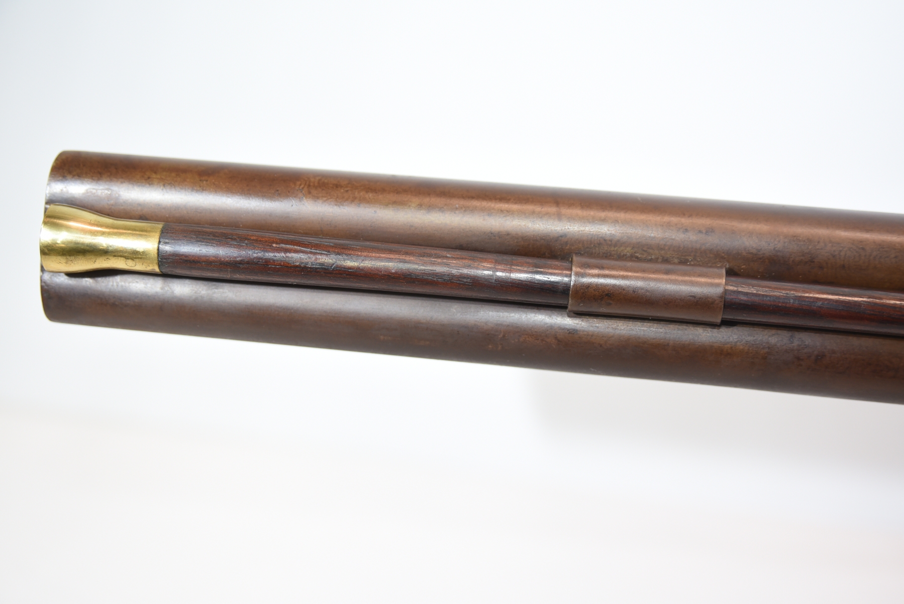 The consignor has asked us to add the following information: Samuel Nock Very Rare SXS. Copper percussion cap containing the detonating composition, now made of three parts of chlorate of potash, two of fulminate of mercury and one of powdered glass. The hollow in the hammer contained the fragments of the cap if it fragmented, reducing the risk of injury to the firer's eyes. While the metal percussion cap was the most popular and widely-used type of primer, their small size made them difficult to handle under the stress of combat or while riding a horse. Accordingly, several manufacturers developed alternative, "auto-priming" systems. The "Maynard tape primer", for example, used a roll of paper "caps" much like today's toy cap gun. The Maynard tape primer was fitted to some military firearms used in the American Civil War. Other disc or pellet-type primers held a supply of tiny fulminate detonator discs in a small magazine. Cocking the hammer automatically advanced a disc into position. This example of Samuel Nock’s SXS shot gun made use of this adaptation on small fulminate disks in the hammer’s head.