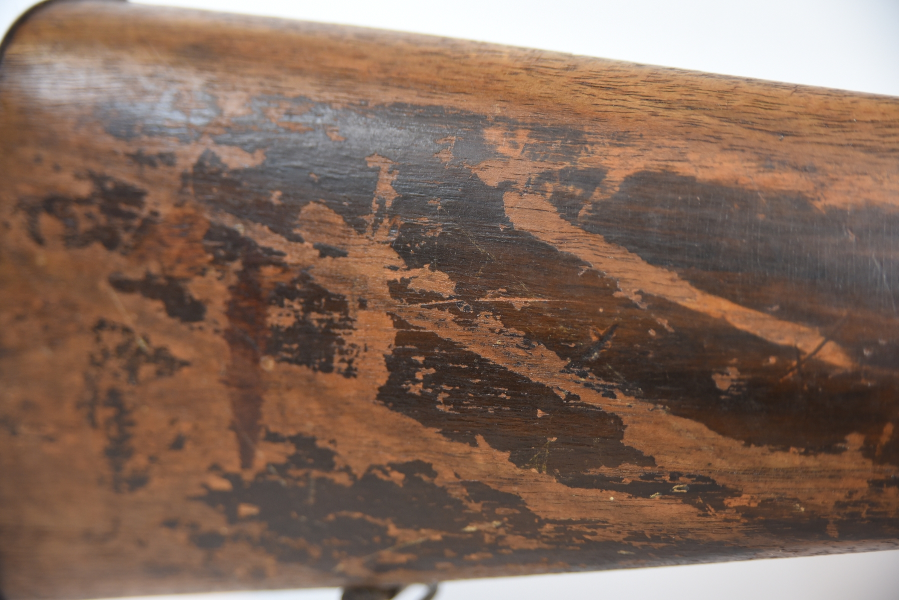 Wood stock shows finish wear, scratches, scuffs, light dents; condition is less than fair for age.