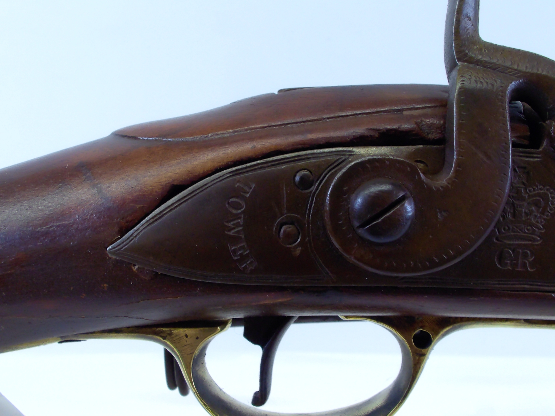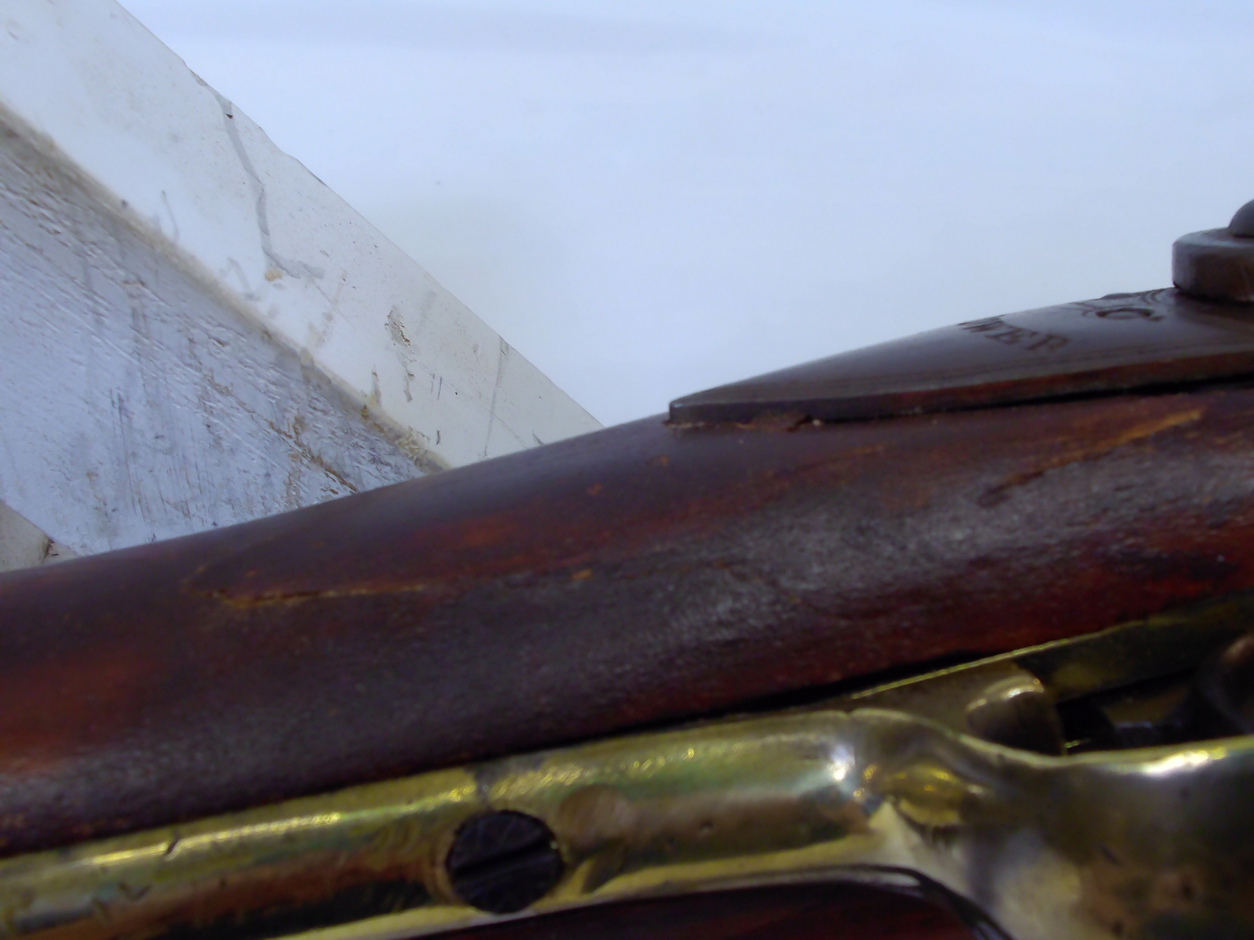 Wood stock shows scratches, scuffs, light dents, there are chips around the lock plate area, there are fine long cracks on either side of grip/lock plate area; condition is good for age.