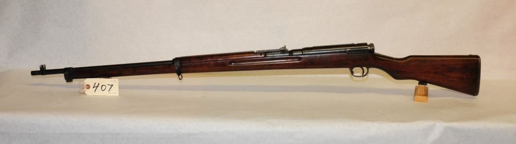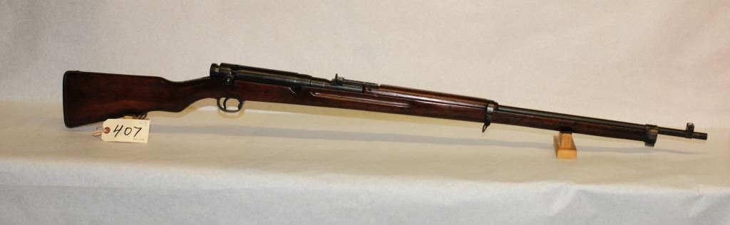 Non-restricted, bolt action, 6.5 x 50SR Japanese Arisaka, 31" barrel, SN 54464. Wood butt repaired, bluing is brown, bore stained with prominent rifling. Missing mag.