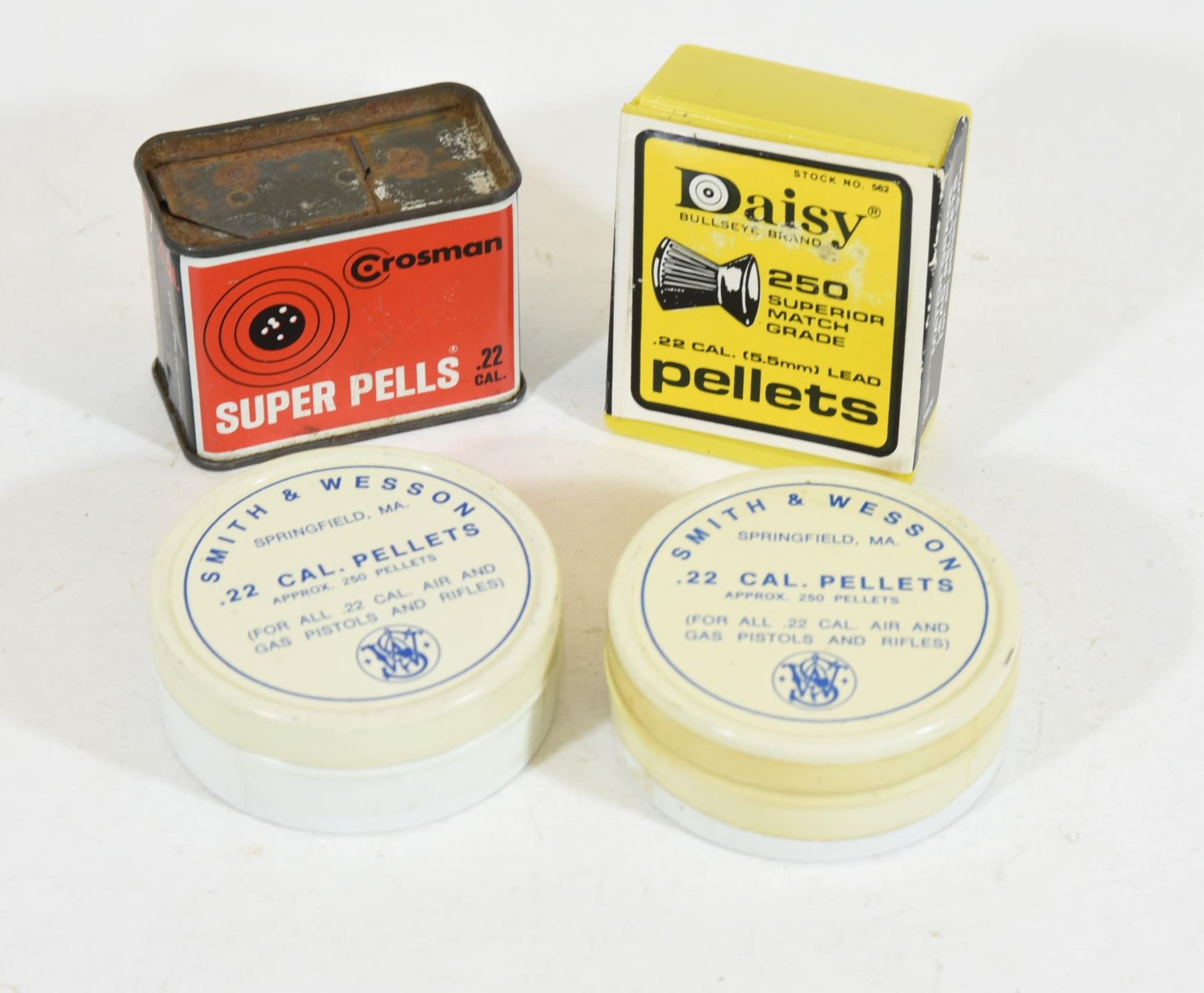 Two unknown quantity tins of S&W 22cal pellets. Unknown quantity tin of Crosman 22cal Super Pellets. Unopened 250-piece box of Daisy Match Grade 22cal pellets.