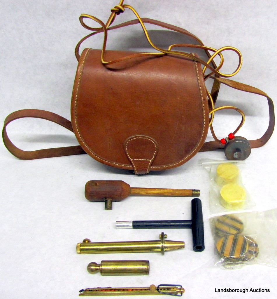 LEATHER POUCH, CAPPING TOOL, POWDER MEASURES, BULLET STARTERS, ROUND BALL LUBED PATCHES. APPROX 7 SQ FT PATCH MATERIAL (.013 THICKNESS).