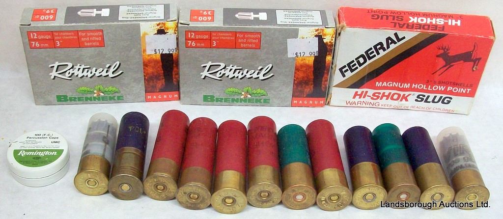 10 RNDS FEDERAL 3 INCH SLUGS, 10 RNDS BRENNEKE 3 INCH SLUGS, 7 RNDS VARIOUS SLUGS, TIN OF 100 FC PERCUSSION CAPS.