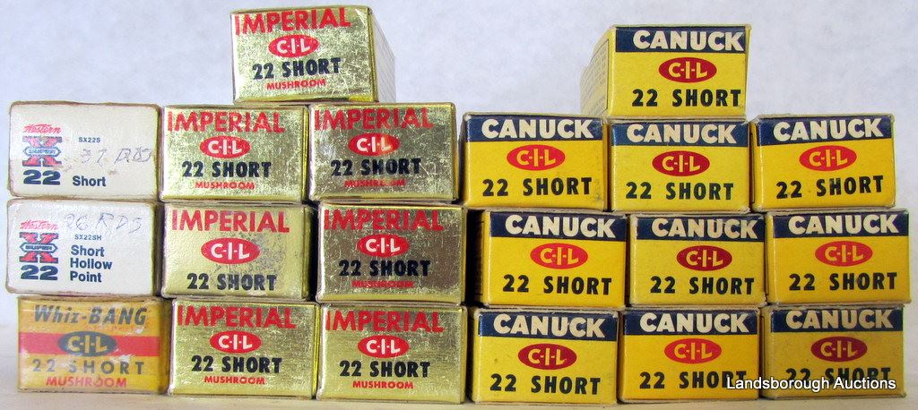 10 BOXES OF CANUCKS [500RDS], 6 IMPERIAL MUSHROOM SHORTS [300] , 1 IMPERIAL SOLID [50] , 1 SUPER X SOLID [37RDS], 1 SUPER HOLLOW PT [26 RDS], FOR A TOTAL OF 913 ROUNDS.