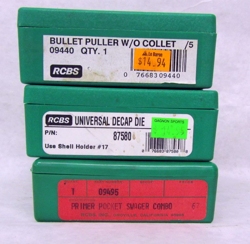 COLLET-STYLE BULLET PULLER DIE, WITH .30 AND .22 COLLETS, EXCELLENT CONDITION. UNIVERAL DECAPPING DIE, EXCELLENT CONDITION. PRIMER POCKET SWAGER COMBO DIE, VERY GOOD CONDITION.