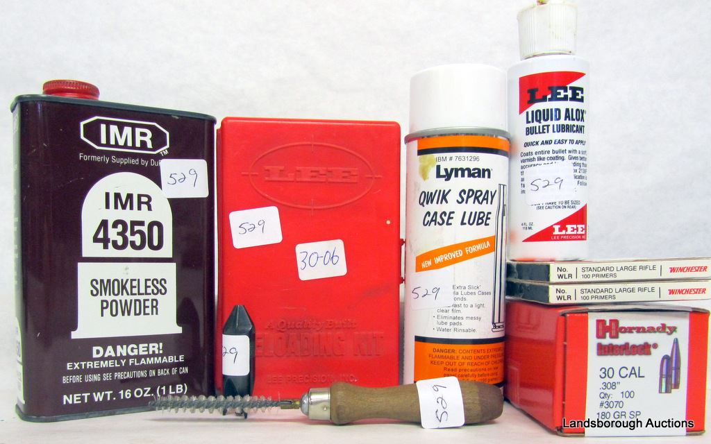 LEE LOADING KIT 30-06, HORNADY 30 CAL LEAD - 180 GRN SP, WINCHESTER LARGE RIFLE PRIMERS, LYMAN CASE LUBE, LEE LIQUID ALOX, IMR 4350 POWDER (1 LB), PRIMER POCKET BRUSH, DEBURRING TOOL.