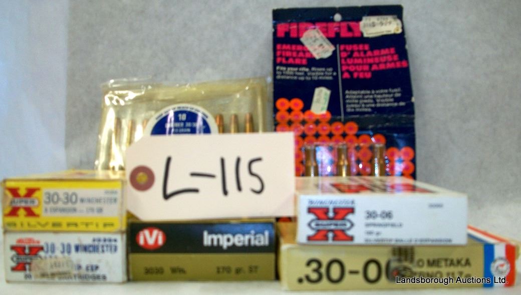 70 ROUNDS OF 30-30 FACTORY AMMO AND 40 ROUNDS OF 30-06 FACTORY AMMO AND 3 FIREFLY 30-06 FLARES.