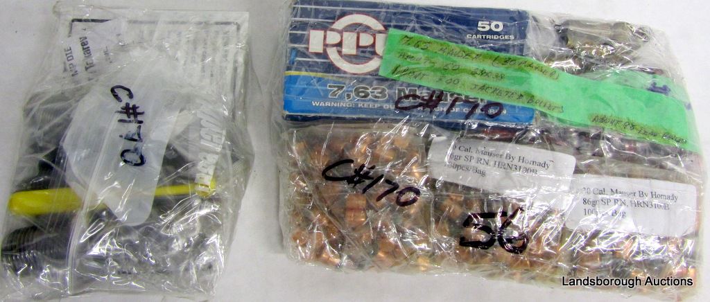 60 BRASS, 300 JACKETED PROJECTILES AND A LEE DIES SET.