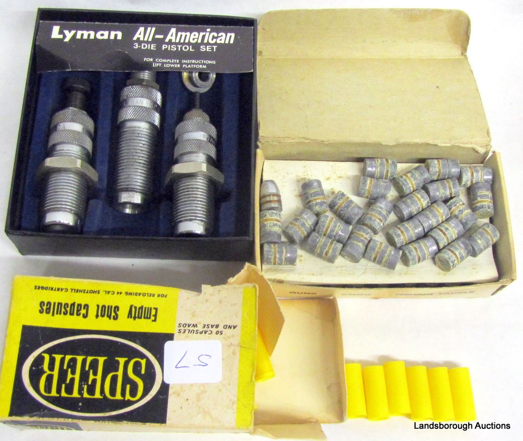 LYMAN DIE SET, SPEER SHOT CAPSULES, 44 MAG BRASS, 44 SPL BRASS, 25 RNDS 44 MAG SHOT RELOADS, 3 RNDS 44 MAG RELOADS, 8 RNDS 44 SPL RELOADS, TWO BOXES 429 LEAD PROJECTILES.
