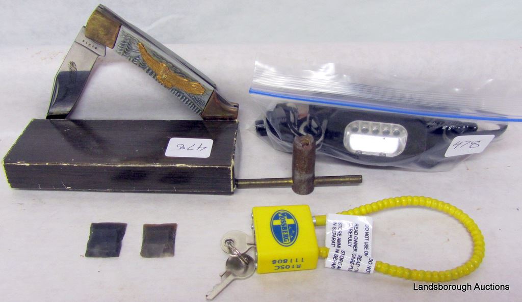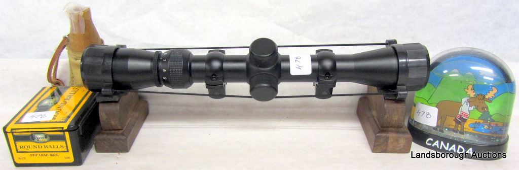 TASCO 3-9 X 32 SCOPE WITH TIP OFF RINGS AND COVERS, 57 CAL LEAD BALL, CAROLINA LED HEAD LAMP, TWO FLINTS, NIPPLE WRENCH, FOLDING KNIFE 3 1/2 IN BLADE, CANADA SNOW GLOBE, CABLE LOCK, ROUND BALL LEATHER FLASK.