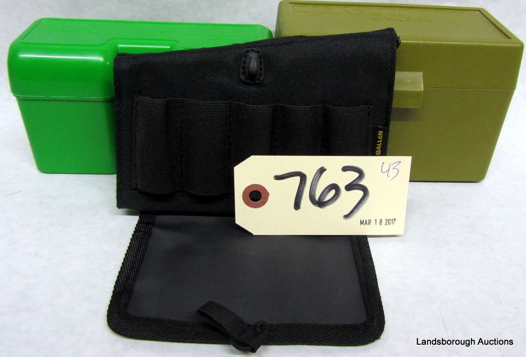 TWO SHELL BOXES, ONE SHOTSHELL CARRIER, AND A RIFLE REST