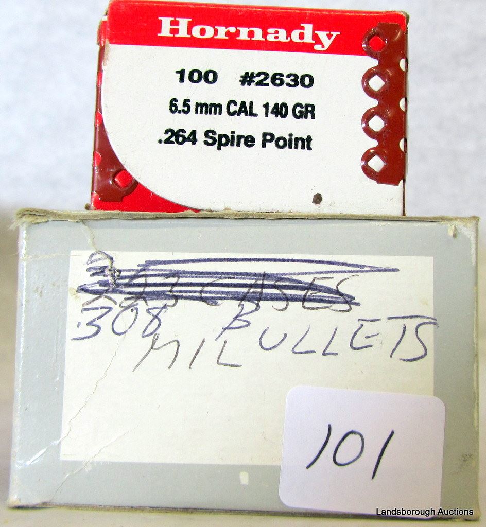60RDS OF 7MM MAUSER RELOADS,20 RDS OF NEW WIN BRASS, 100 - 7MM BULLETS, 100 HORNADY 6.5 CAL 140GR SPIRE POINT, 50 - 30 CAL FMJ BULLETS.