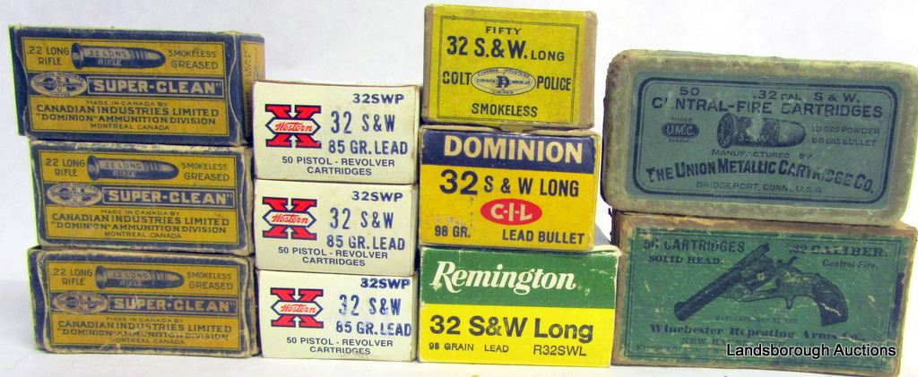 150 RNDS WESTERN 32 S&W; 150 RNDS REMINGTON AND CIL 32 S&W LONG; 15 RNDS UMC 32 S&W IN VINTAGE BOX; 14 RNDS WINCHESTER 32 S&W IN VINTAGE BOX; 150 RNDS CIL 22LR IN VINTAGE BOXES.