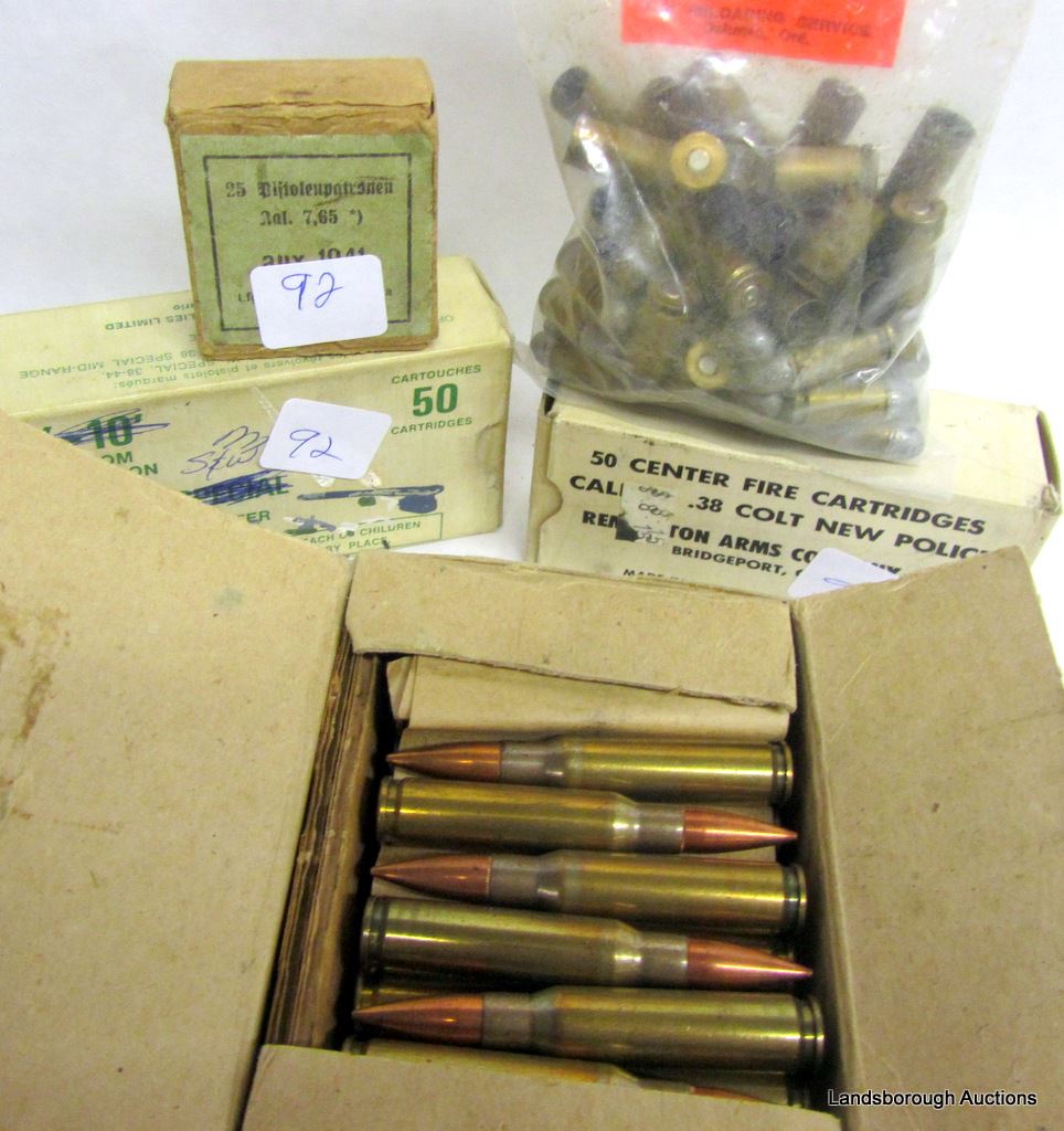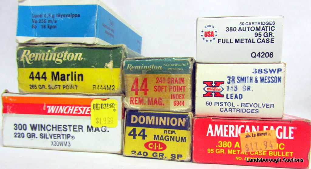 65 RNDS AMERICAN EAGLE AND OLIN 380 AUTO; 39 RNDS DOMINION AND REMINGTON 44 REM MAG; 47 RNDS 7.65MM; 40 RNDS 7.62 NATO; 11 RNDS REMINGTON 444 MARLIN; 13 RNDS WINCHESTER 300 WIN MAG; 50 RNDS REMINGTON 38 COLT; 79 RNDS 38 S&W; 35 RNDS 9MMM LUGER; 28 RNDS WINCHESTER WESTERN 38 S&W.