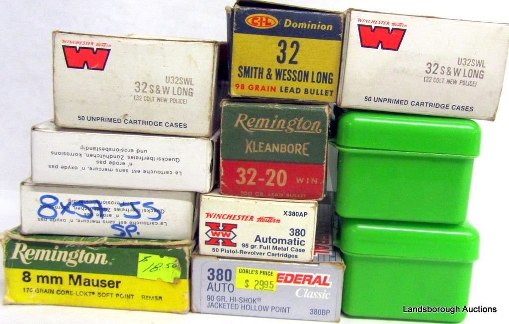 134 RNDS 32 S& W LONG FAACTORY AND RELOADS, 23 RNDS DOMINION 32-20 WIN, 42 RNDS 9MM LUGER RELOADS, 28 RNDS 8 X 57JS, 20 RNDS REMINGOTN 8MM MAUSER, 142 RNDS 380 AUTO FACTORY AND RELOADS.