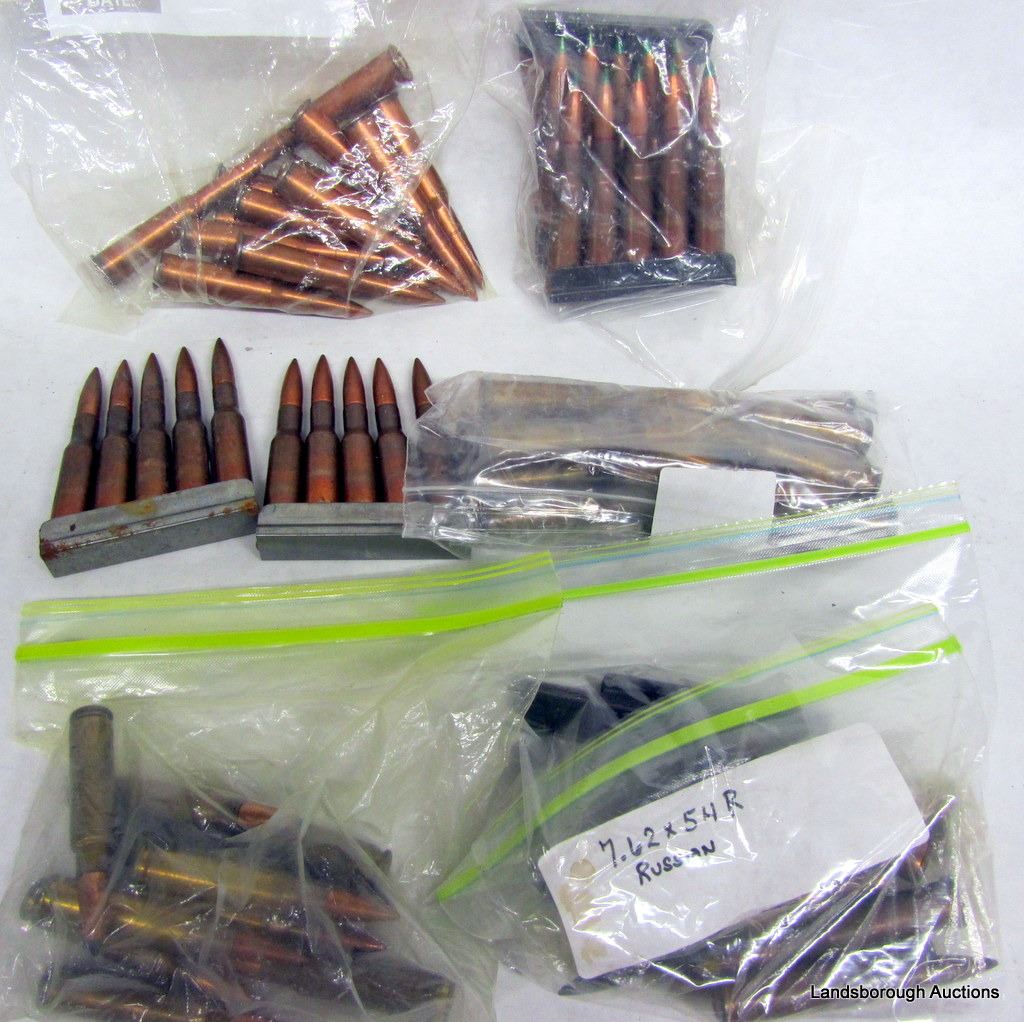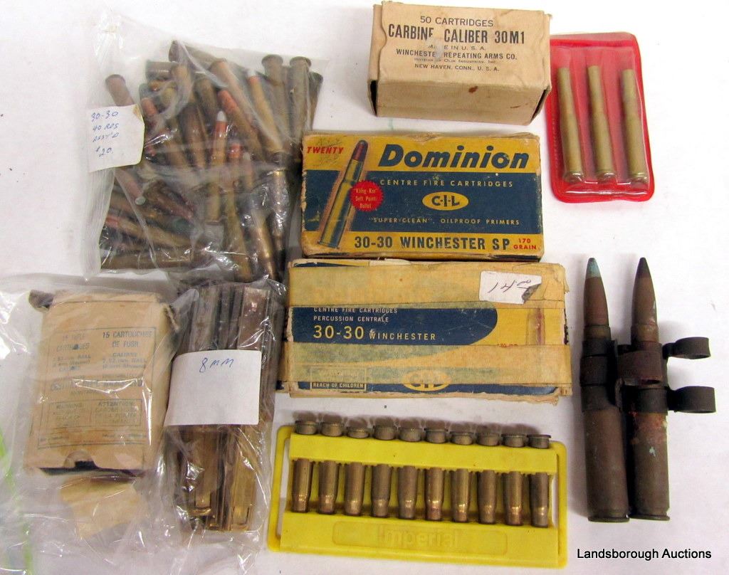 84 RNDS 7.62 X 54 SURPLUS, 89 RNDS 30-30WIN, 15 RNDS 8MM MAUSER WITH SOME STRIPPER CLIPS, 74 RNDS 30 CARBINE, 2 RNDS 20MM, 3 RNDS 30-30 FLARES.