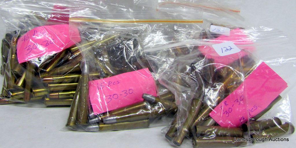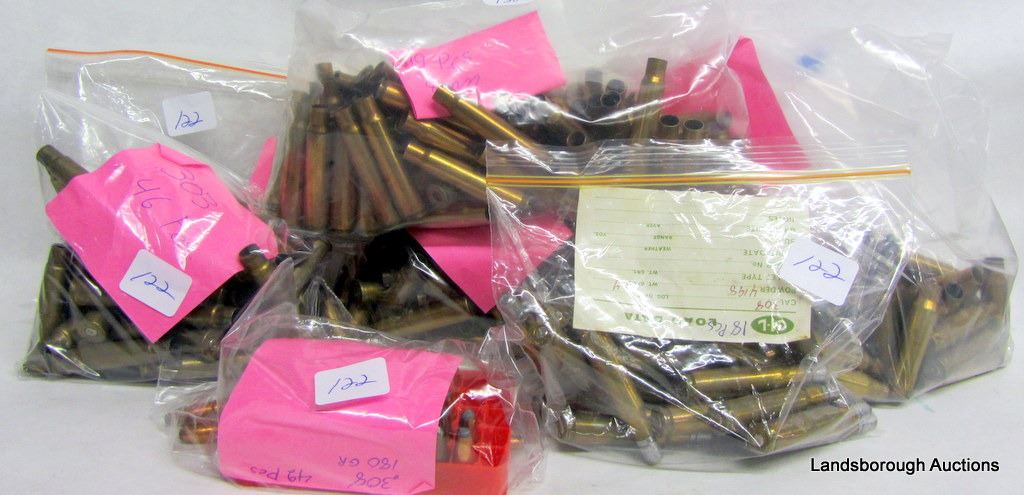 61 RNDS 30-30 WIN RELOADS AND 200 BRASS; 18 RNDS 308 WIN RELOADS, 88 BRASS, 42 PROJECTILES; 11 RNDS 303 BRITISH RELOADS AND 97 BRASS; 99 PCES 8MM BRASS.