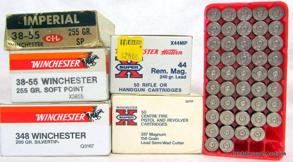 20 RNDS WINCHESTER 348 WIN; 35 RNDS WINCHESTER AND IMPERIAL 38-55 WIN; 12 RNDS 44 REM MAG; 15 RNDS 357 MAGNUM RELOADS; 20 RNDS 38 SPL RELOADS.