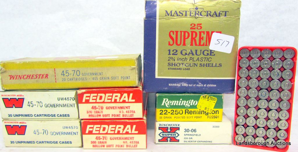 20 RNDS REMINGTON 22-250 REM; 40 RNDS FEDERAL FACTORY 45-70 GOVT; 39 RNDS 45-70 GOVT RELOADS; 16 RNDS WINCHESTER FACTORY 30-06 SPRG; 50 RNDS 38 SPL RELOADDS; 20 RNDS MASTERCRAFT 12GA X 2 3/4" SHOTSHELLS.
