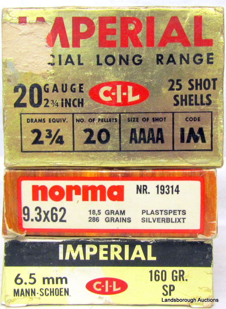 25 RNDS IMPERIAL 20GA X 2 3/4" WITH AAAA SHOT IN VINTAGE BOX; 20 RNDS IMPERIAL 6.5MM MANN-SCHOEN; 20 RNDS NORMA 9.3 X 62 .