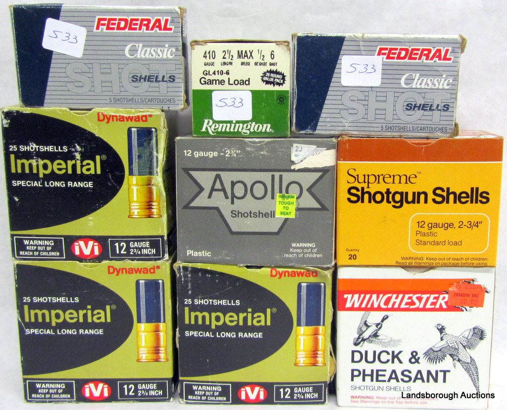 18 RNDS REMINGTON 410GA X 2 1/2"; 8 RNDS FEDERAL BUCK SHOT; 70 RNDS IMPERIAL 12GA X 2 3/4"; 8 RNDS SUPREME 12GA, 12 RNDS WINCHESTER 12GA; 20 RNDS APOLLO 21GA X 2 3/4".