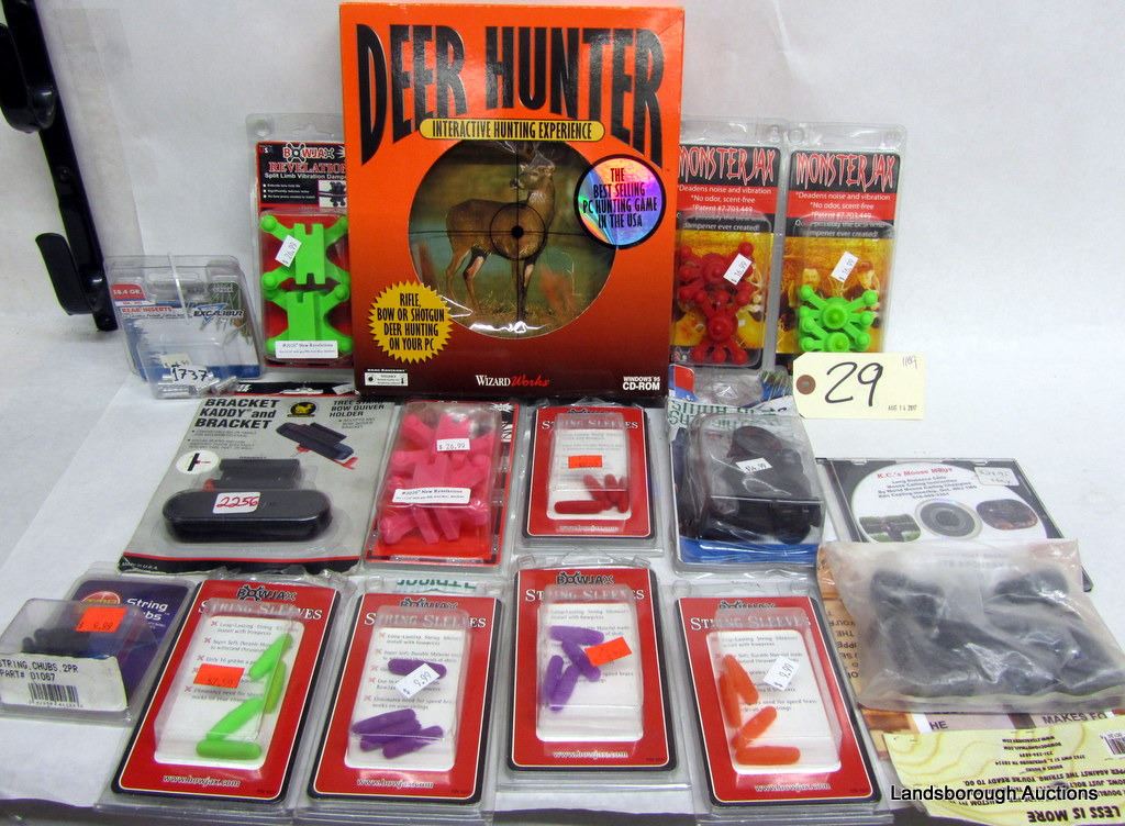 STRING SLEEVES, SUPRESSOR, MONSTER JAX, BOW JAX, BRACKET KADDY, STRING CHUBBS, REAR INSERTS, SHOCK MERMINATOR SUPPRESSOR, PLUS ONE DVD AND DEER HUNTER GAME.