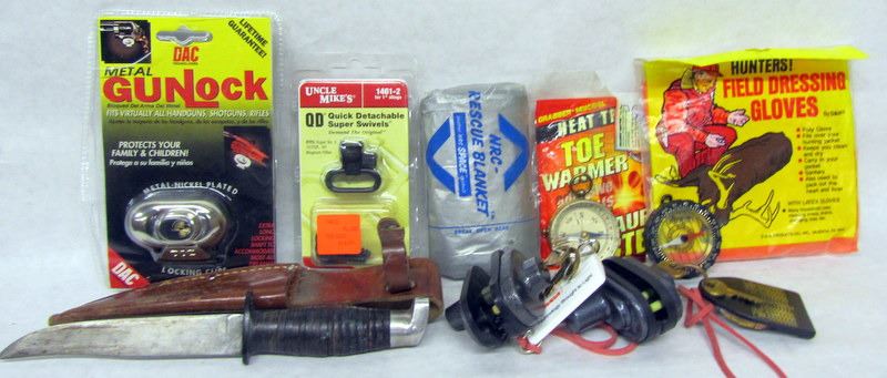 3 TRIGGER LOCKS, WITH KEYS. EMERGENCY BLANKET. HUNTING KNIFE. GAME CLEANING GLOVES. 3 COMPASSES. QD SLING SWIVELS. TOE WARMERS