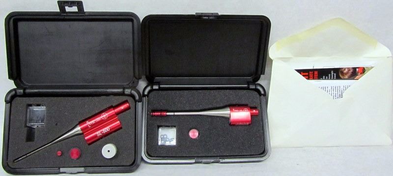 TWO S-LITE LASER BORESIGHTERS. MODELS SL-500 AND SL-100. WITH SPARE BATTERIES, MANUALS, AND ACCESSORIES.