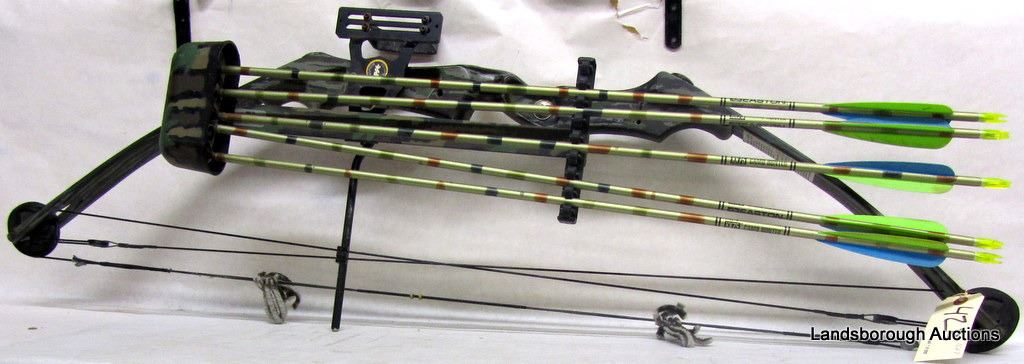 ONE BEAR COMPOUND BOW, RIGHT HANDED 70LB, INCLUDES QUIVER AND 5 ARROWS. ONE BEN PEARSON COUGAR RECURVE BOW, 50LB RIGHT HANDED (MISSING STRING)