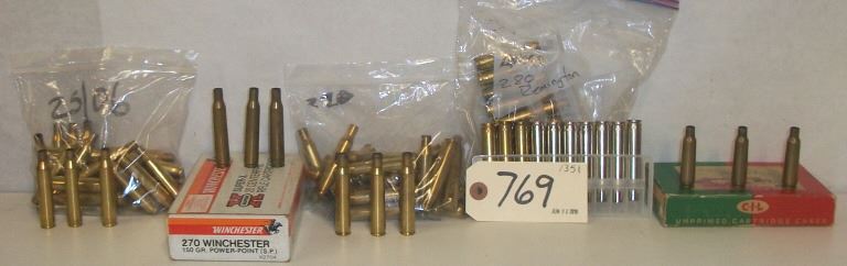 BAG OF 25 - 06 BRASS, BAG PLUS 20 PCS 270 BRASS, 20 PCS. 280 BRASS, M20 PCS. 250 SAVAGE BRASS, 47 PCS. 300 SAVAGE BRASS, 8 PCS, 222 BRASS, 7 PCS 32 REM. BRASS, 16 PCS. 303 BRITISH, ROUGHLY 194 PCS OF 38 - 55