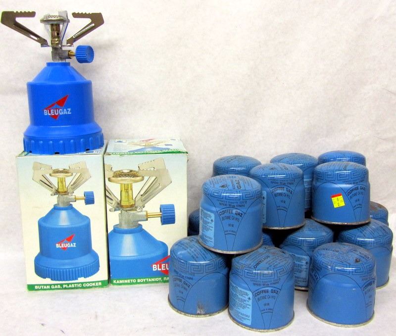 TWO BUTANE STOVES, NEW IN BOXES. 16 BUTANE CANISTERS. PICK UP ONLY, WILL NOT SHIP.