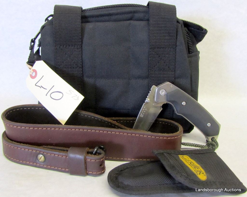 LARGE BLACK NYLON CAMERA CASE, BUCK FOLDING KNIFE WITH SHEATH, BROWN LEATHER SLING.