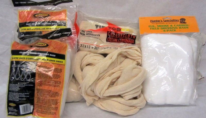 LARGE ASSORTMENT OF CHEESECLOTH FOR WRAPPING GAME MEAT IN THE FIELD. NEW, MOST IN PACKAGING.