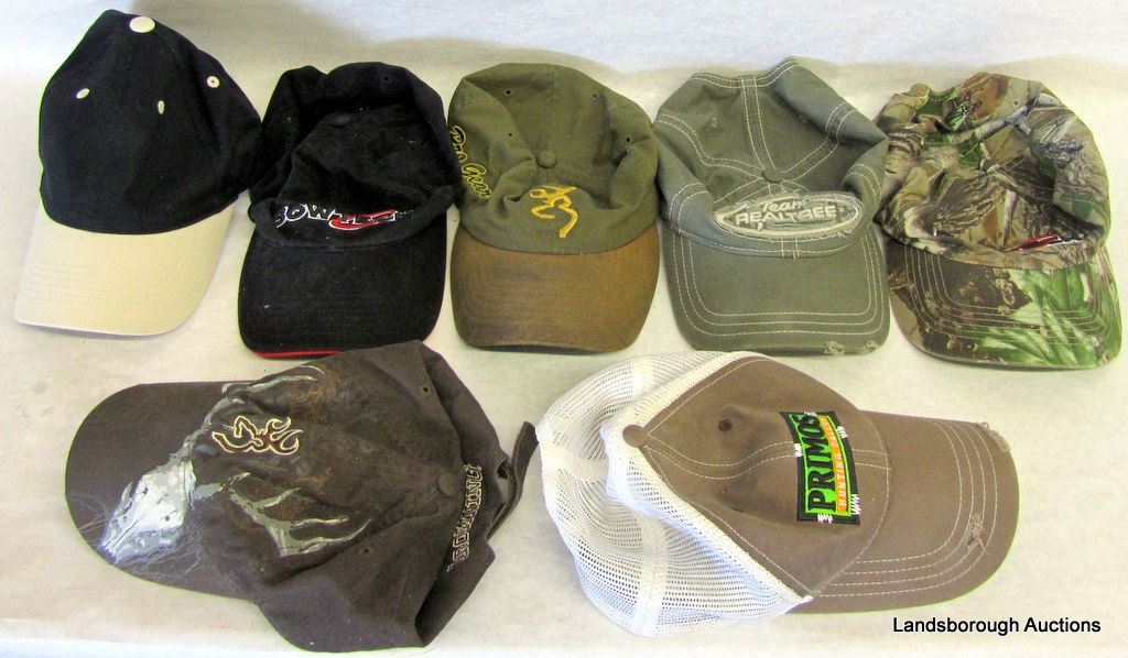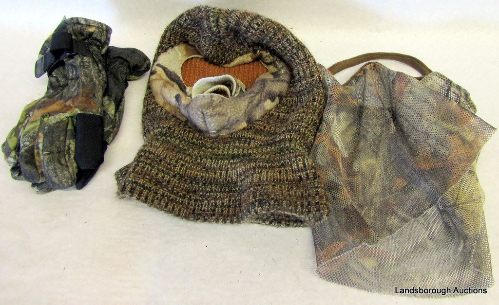 8 ASSORTED HUNTING HATS, 1 PAIR GLOVES, 1 BALACLAVA, ONE MESH FACEMASK, ONE BONE COLLETCTOR REALTREE JACKET
