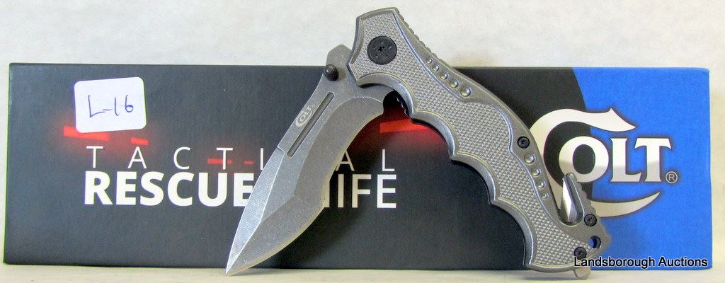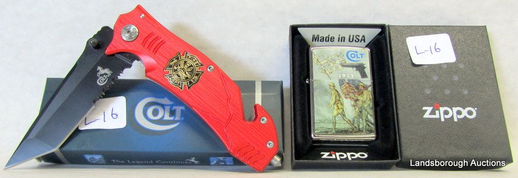 COLT FIREFIGHTER KNIFE, COLT TACTICAL RESCUE KNIFE, AND ZIPPO LIGHTER WITH COLT 1911 WWI SCENE PRINTED.