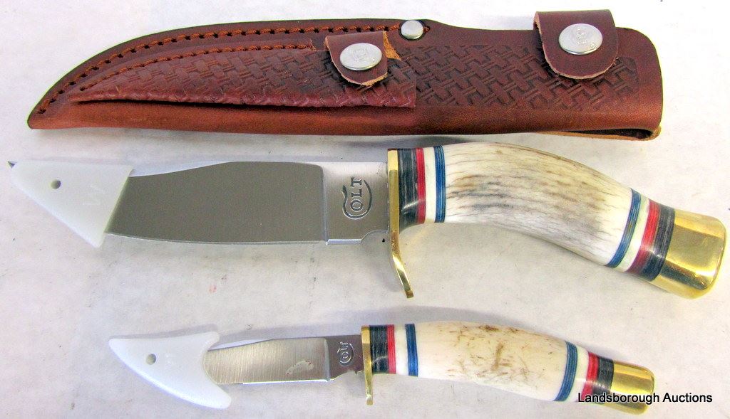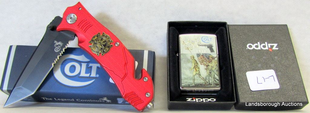 COLT FIREFIGHTER KNIFE, COLT LARGE AND SMALL STAG HANDLE KNIVES, AND ZIPPO LIGHTER WITH COLT 1911 WWI SCENE PRINTED.