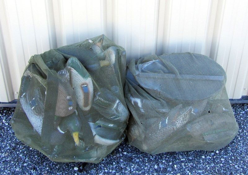 APPROXIMATELY 20 DUCK DECOYS, IN 2 DECOY BAGS, WITH WEIGHTS. PICK UP ONLY, WILL NOT SHIP.