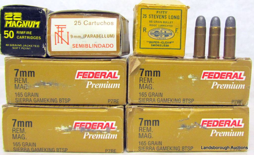 80 RNDS FEDERAL PREMIUM 7MM REM MAG; 25 RNDS EMPRASA NACIONAL 9MM PARABELLUM; 50 RNDS RUKO 22 MAGNUM; 16 RNDS DOMINION 32 S&W IN A 25 STEVENS BOX.