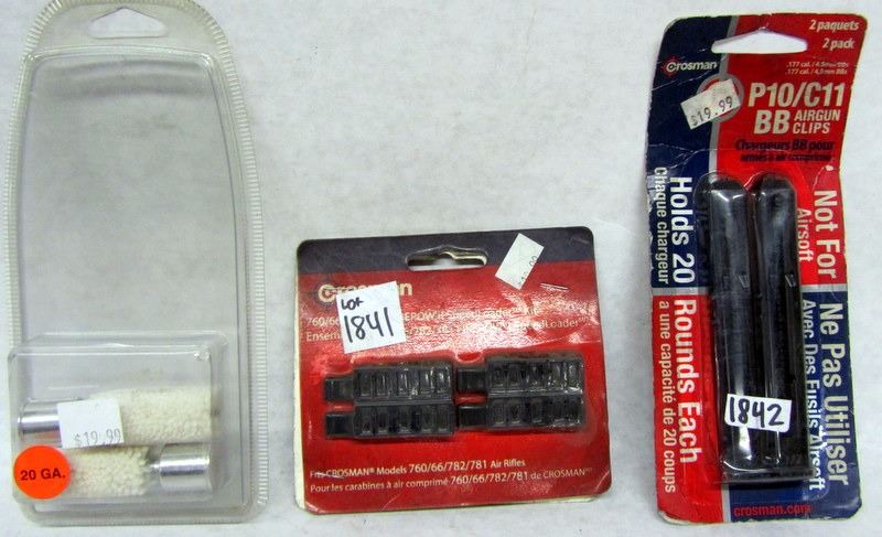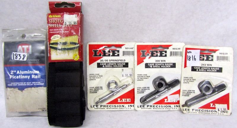 3 LEE CASE LENGTH GAUGES AND SHELLHOLDERS, FOR 308 WIN, 243 WIN, AND 30-06. 2 MAGAZINES FOR CROSSMAN P10/C11 PISTOLS. 2 ATI 2" PICATINNY RAILS. 20 GAUGE SNAP CAPS. ALLEN SHOTGUN SHELL BELT. CROSSMAN AIR RIFLE SPEEDLOADER