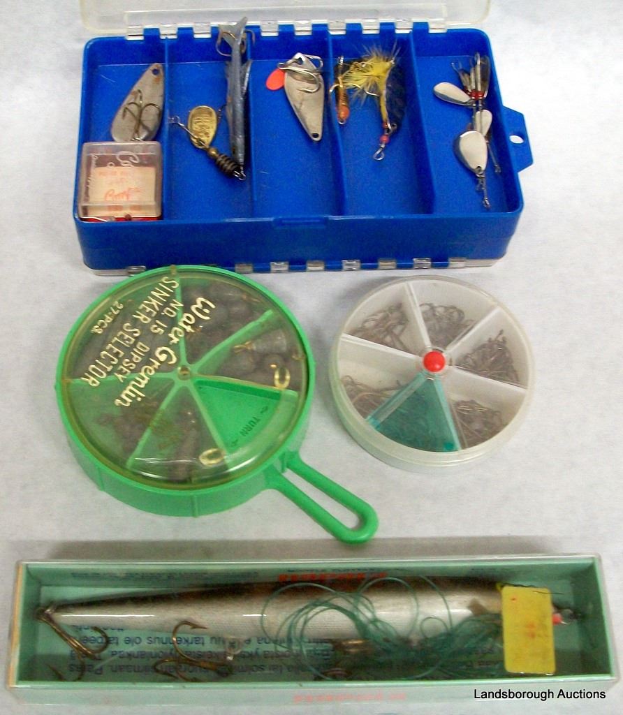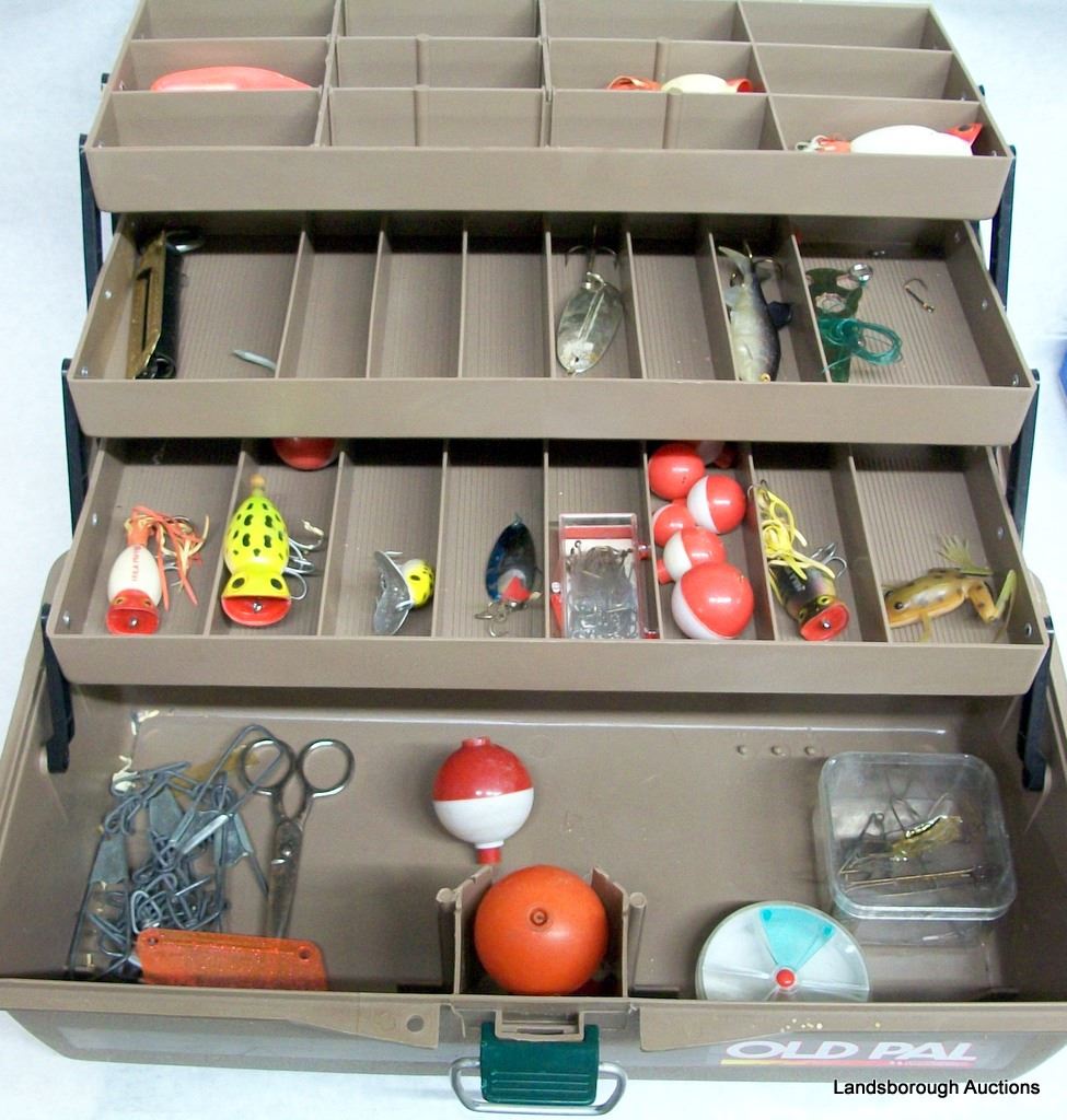 OLD PAL TACKLE BOX FULL OF LURES, MITCHELL 410 REEL AND SHAKESPEARE ALPHA 7 FT ROD.