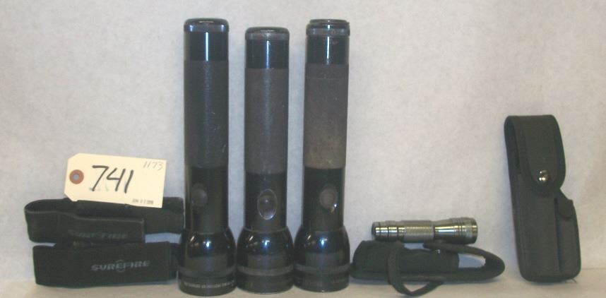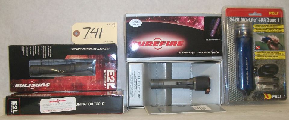 THREE USED MAG LIGHTS TWO HAVE NO BULBS, THREE SUREFIRE FLASH LIGHTS APPEAR TO BE NEW IN BOXES, TWO MODEL E2L OUTDOORSMAN, ONE MODEL E2e EXECUTIVE ELITE, A CABELAS, PELI 2420 MITYLITE NEW IN PACKAGE , BATTERIES ARE