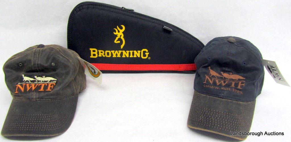 NWTF HATS, BROWNING SOFT PISTOL CASE, DUCK DYNASTY UNCLE SI DUCK CALL, GOOSE FLUTE, EASY CHUCKLE AND LANYARD, 3 JENOLITE RUST/ BLUE REMOVER, 8 JENOLITE BARREL CLEANER.