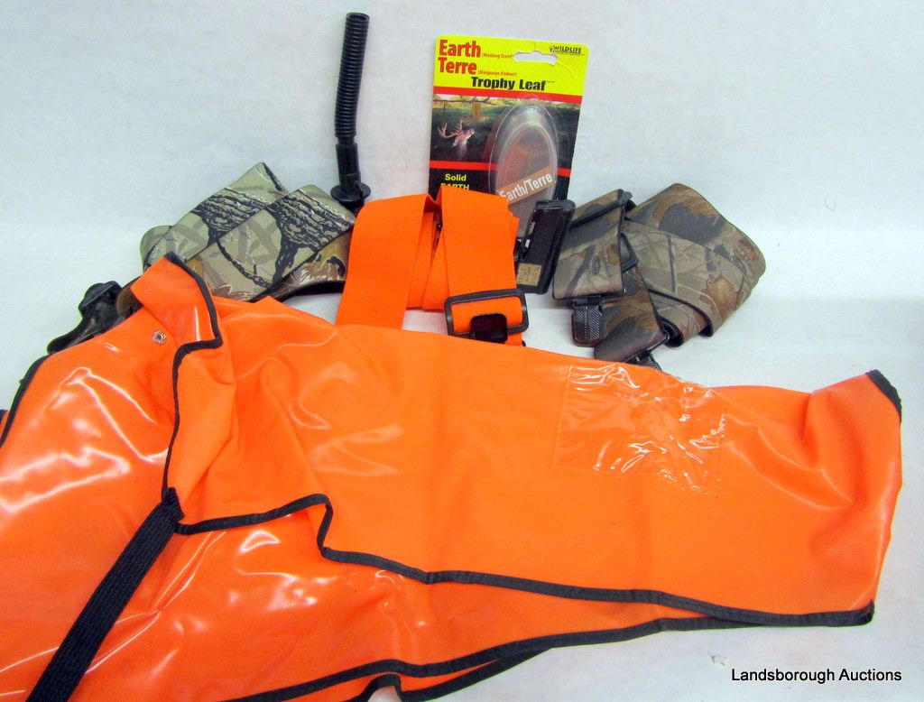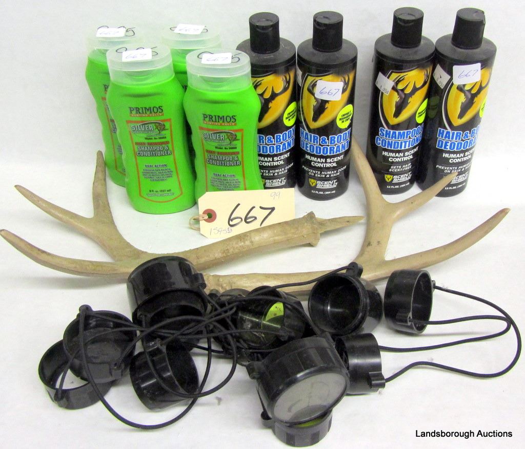 HUNTER ORANGE VEST, 2 CAMO SUSPENDERS, 1 HUNTER ORANGE SUSPENDER, 1 EARTH TERRE, 1 SET OF RATTLING ANTLERS, 1 PRIMO STILL GRUNTER CALL, 1 COOEY MAGAZINE, 8 SCOPE COVERS, 4 BOTTLES OF PRIMO SHAMPOO AND CONDITIONER, 4 BOTTLES OF SCENT SHIELD SHAMPOO AND CONDITIONER.