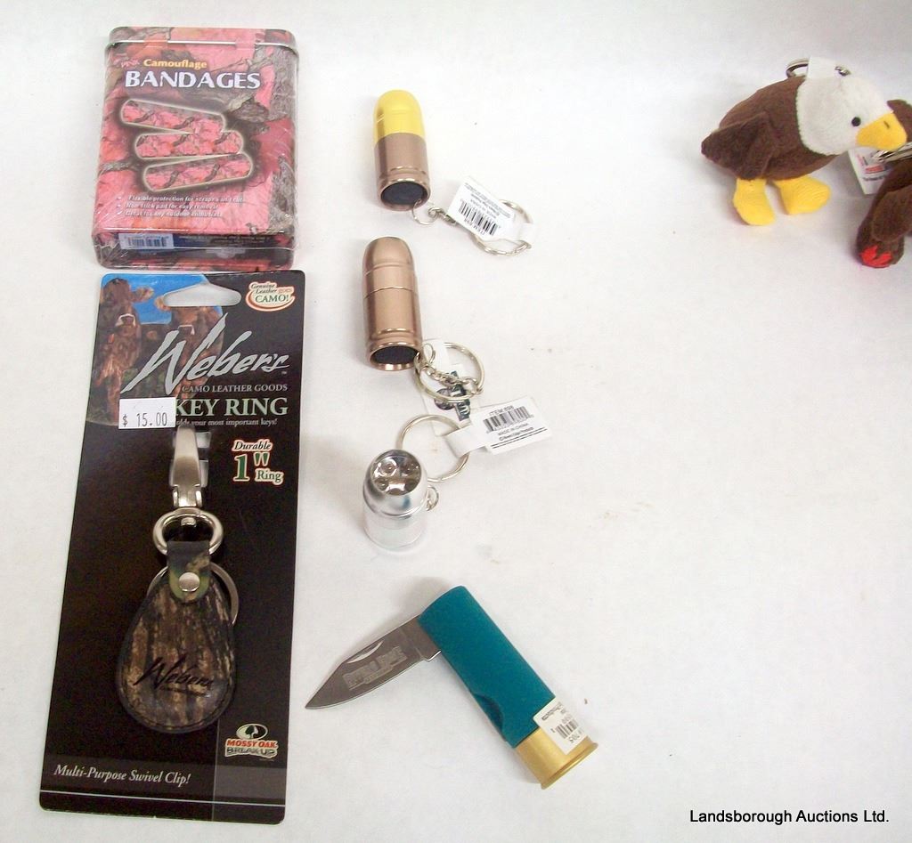 ANIMAL KEY CHAINS, AMMO KNIFE, FLASHLIGHT KEY RINGS, REM SKIN, CAMO BANDAIDS.