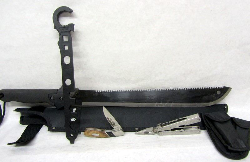 NC STAR ARMOURERS WRENCH. GERBER MACHETE. ELK RIDGE POCKET KNIFE. STAINLESS STEEL MULTI TOOL. TWO EMPTY NYLON SHEATHS.