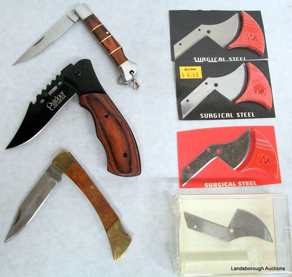 TWO OUTDOOR CANADA FOLDING KNIVES (NEW), FOUR GUT HOOK REPLACEMENT BLADES (NEW), CANPRO FOLDING KNIFE (USED).
