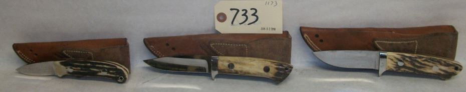 THREE H.J. SCHNEIDER KNIVES, # 301 WITH MATCHING NO. SHEATH, # 302 WITH MATCHING NO. SHEATH, # 303 IN A # 251 SHEATH, LAGUNA MIGUEL CALIFORNIA