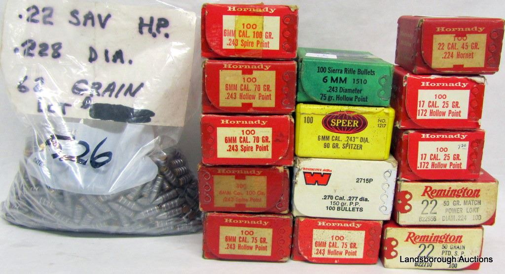 REMINGTON 224, HORNADY 224, HORNADY 17, WINCHESTER 277, HORNADY 243/ 6MM, SPEERS 6MM, SIERRA 6MM, UNKNOWN 228 FOR 22 SAVAGE HP. TOTAL 14.8 LBS.