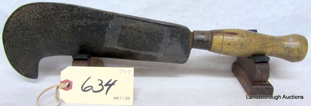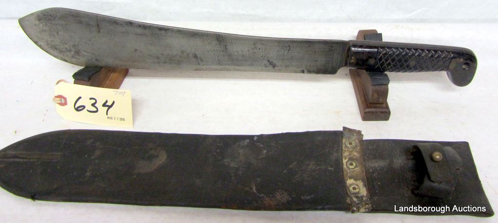 BRITISH ARMY BILL HOOK AND BOLO STYLE MACHETE WITH LEATHER SHEATH DATED 1944.