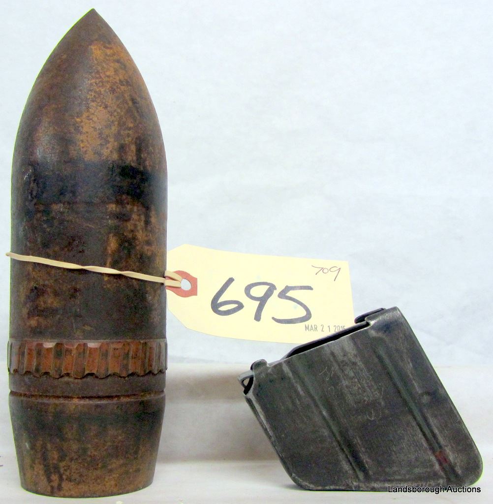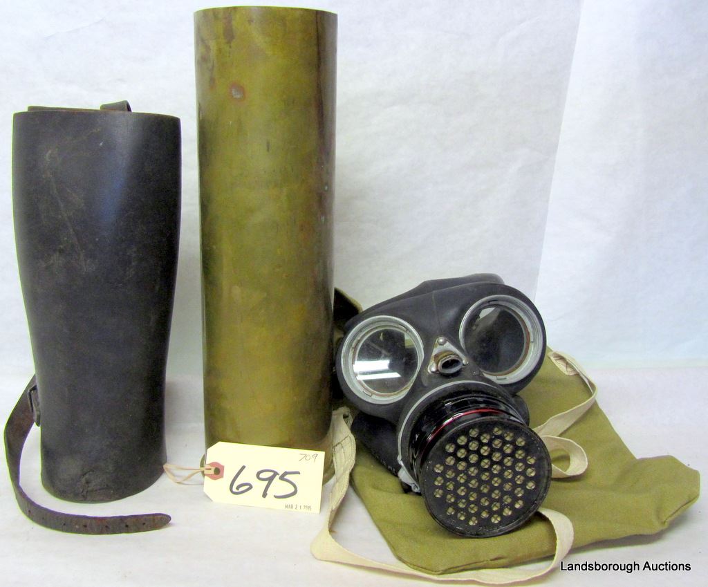 GAS MASK, 105MM BRASS SHELL, 75MM PROJECTILE, LEE ENFIELD MAGAZINE, LEATHER GATORS.